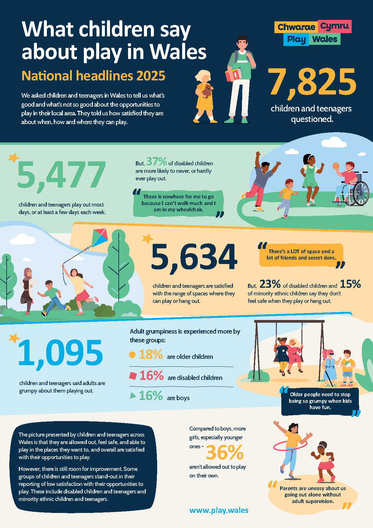 Whilst we are pleased that the picture presented by children and teenagers across Wales is that they are allowed out, feel safe, and able to play in the places they want to, and overall are satisfied with their opportunities to play, there is room for improvement.